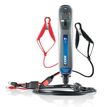 Automatická nabíječka baterií EXIDE 7A pro baterie 1 - 150Ah Plně automatická nabíječka byla vyvinuta speciálně pro baterie Exide, ale může se používat i na jiné baterie. Nabíjí všechny typy baterií, tedy olověné, gelové i AGM. Má vestavěný teplotní senzor, který měří okolní teplotu a brání přebití, bezpečnostní funkci proti přepólování baterie, nebo poškození baterie, vestavěnou lampu pro připojování ve tmě, speciální svorky pro rychlé a bezpečné připojení