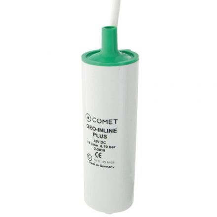 Posilovač průtoku pro ponorná čerpadlaVýkonné posilovací čerpadlo (booster) Comet Geo-Inline-Plus – 12 V, 19 l/min, 0,7 bar je vhodné k zabudování do potrubního systému za prvním čerpadlem kvůli zvýšení průtoku. Ideální pro modernizaci stávajících systémů.Vlastnosti ponorného čerpadla Geo-Inline-Plus:Čerpadlo není samonasávací.Provoz na sucho je bezpečný po dobu až 30 minut.Vhodné pro pitnou vodu.Pro čerpání čisté vody do max. teploty 60 °C.Možnost rozšíření o zpětný ventil a filtr.Parametry:průtok: 19 l/mintlak: 0,7 barvýtlačná výška: 7 mnapětí: 12 Vjmenovitý proud: 3,8 Ajmenovitý příkon: 50 Wdélka kabelu: 1 mprůměr: 42 mmvýška: 150 mmhmotnost: 211 g