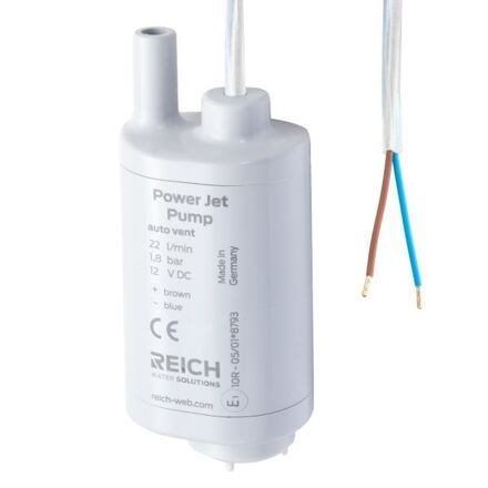 Ponorná pumpa do vodní nádrže karavanuPonorné čerpadlo Reich Power Jet Plus – 12 V, 22 l/min, 1,8 bar může být připojeno přímo k baterii 12 V nebo k transformátoru s usměrněným proudem. Čerpadlo lze ovládat spínačem ve vodovodním kohoutku, tlakovým spínačem nebo tlačítkovým spínačem. Čerpadlo je bezúdržbové. Po krátkou dobu může běžet na sucho. Čerpadlo je vyrobeno z plastů, které jsou fyziologicky neškodné. Výstupní hadice se připojuje prvkem systému UniQuick.Vlastnosti ponorného čerpadla Reich Power Pump Easy:Může být připojeno přímo k baterii 12 V nebo k transformátoru s usměrněným proudem.Po krátkou dobu může běžet na sucho.Má velmi dlouhou životnost díky high-tech konstrukci těsnění.Je vhodné pro čerpání pitné vody.Má mimořádně tichý provoz.Povrch čerpadla je odolný vůči usazování nečistot, snadno se čistí.Parametry:připojení hadice: UniQuicktlak: 1,8 barvýtlačná výška: 18 mprůtok: 22 l/mindélka kabelu: 1 mpříkon: 70 Wnapětí: 12 Vproud: 5,8 Ašířka: 177 mmhloubka: 54 mmvýška: 171 mmhmotnost: 270 g