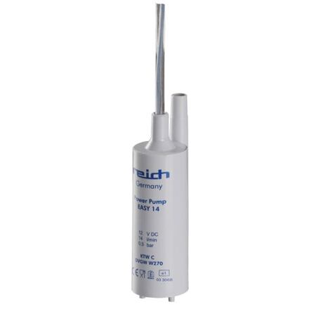 Ponorné čerpadlo na vodu do karavanuPonorné čerpadlo Reich Power Pump Easy – 12 V, 14 l/min, 0,5 bar může být připojeno přímo k baterii 12 V nebo k transformátoru s usměrněným proudem. Čerpadlo lze ovládat spínačem ve vodovodním kohoutku, tlakovým spínačem nebo tlačítkovým spínačem. Čerpadlo je bezúdržbové. Po krátkou dobu může běžet na sucho. Čerpadlo je vyrobeno z plastů, které jsou fyziologicky neškodné. Výstupní hrdlo je vhodné pro hadici o vnitřním průměru 10 mm nebo 12 mm.Vlastnosti ponorného čerpadla Reich Power Pump Easy:Může být připojeno přímo k baterii 12 V nebo k transformátoru s usměrněným proudem.Po krátkou dobu může běžet na sucho.Je vhodné pro čerpání pitné vody.Má mimořádně tichý provoz.Povrch čerpadla je odolný vůči usazování nečistot, snadno se čistí.Parametry:tlak: 0,5 barvýtlačná výška: 4 mprůtok: 14 l/mindélka kabelu: 1 mpříkon: 18 Wnapětí: 12 Vproud: 1,5 Aprůměr: 43 mmvýška: 88 mmhmotnost: 145 g