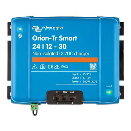 DC-DC nabíječka Victron Energy Orion-Tr Smart 30A: Neizolovaná adaptivní nabíječka s BluetoothDC-DC nabíječka Victron Energy Orion-Tr Smart 30A neizolovaná je navržena pro efektivní nabíjení servisní baterie pomocí inteligentního alternátoru a startovací baterie. Tento model je ideální pro vozidla a lodě, které vyžadují spolehlivý a přizpůsobitelný zdroj energie.Využití a funkce nabíječkyTato nabíječka je určena pro duální bateriové systémy, kde zajistí optimální nabíjení servisní baterie. Díky adaptivnímu třístupňovému algoritmu (rychlé, absorpční, plovoucí) automaticky upravuje nabíjecí proces podle stavu baterie. To zajišťuje maximální životnost baterie a její efektivní využití.Plná kontrola a programovatelnost díky BluetoothNabíječka je vybavena funkcí Bluetooth, která umožňuje snadné monitorování, změnu nastavení a aktualizaci softwaru pomocí aplikace VictronConnect. Jednotku lze také ovládat dálkově přes spínač zapnutí/vypnutí a je vybavena detekcí chodu motoru, což přispívá k její flexibilitě. Zapojení DC-DC nabíječky Victron Energy Orion-Tr Smart pro nabíjení pomocné baterieUniverzálnost a odolnost pro různé podmínkyOrion-Tr Smart je kompatibilní jak s olověnými kyselinovými bateriemi, tak i s lithiovými bateriemi. Nabíječka zvládá i vysoké teploty až do 55 °C, což z ní činí ideální volbu pro náročné podmínky. Navíc nabízí možnost paralelního zapojení více jednotek pro zvýšení výstupního výkonu bez omezení počtu jednotek.Klíčové vlastnosti:Adaptivní třístupňové nabíjení: Automaticky přizpůsobuje proces nabíjení stavu baterie.Bluetooth připojení: Monitorování a programování pomocí aplikace VictronConnect.Vzdálené ovládání: Možnost dálkového zapnutí/vypnutí.Kompatibilita: Vhodná pro olověné i lithiové baterie.Odolnost proti vysokým teplotám: Funguje spolehlivě až do 55 °C.Ochrana IP43: Ochrana proti prachu a vodě při správné instalaci.Jednoduchá instalace: Šroubové svorky nevyžadují speciální nářadí.Ochrana proti zkratu a přehřátí: Bezpečný provoz i v náročných podmínkách.Technické parametry:typ nabíječky: dc-dc adaptivní třístupňová nabíječkavstupní napětí: 24Vvýstupní napětí: 12Vvýstupní proud: 30Amaximální výkon: 360 Wizolace: neizolovanábluetooth: ano, integrované pro monitorování a programováníkompatibilita s bateriemi: olověné kyselinové a lithiové baterieprovozní teplota: -20 °C až +55 °C (při teplotě nad 40 °C se výkon snižuje)ochrana proti zkratu: anoochrana proti přehřátí: ano, automatické snížení výkonu při vysoké teplotěkrytí: IP43 (při instalaci se šroubovými svorkami orientovanými směrem dolů)možnost paralelního zapojení: ano, neomezený počet jednotekrozměry: 130 x 186 x 70 mmhmotnost: 1,8 kgpřipojení: šroubové svorkyvstupní pojistka: ano, nevyměnitelnácertifikace: CE, RoHS