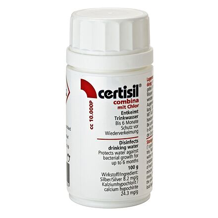 Desinfekce vody Certiman Certisil Combina 10.000 P 100 g prášku pro 10 000 litrů vody Konzervuje pitnou vodu působením chloru a chrání ji po dobu až 6 měsíců před zamořením choroboplodnými zárodky. Nutné pro cestování do států mimo střední a západní Evropu. Přípravek do vody s chlorem používáme jen, pokud máme oplachovou vodu s toalety v samostatné, nikoliv ve společné nádrži. Chlor působí negativně na chemie pro WC