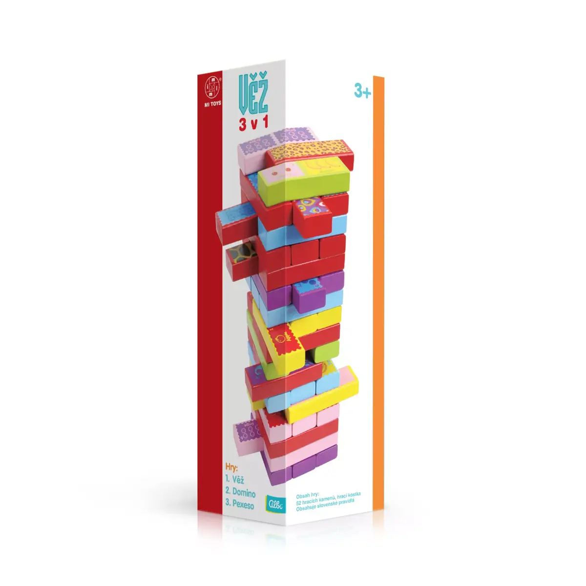Jenga, pexeso a domino v jednom Dřevěná hra Albi Věž 3 v 1 přináší hned tři způsoby, jak se zabavit. Vedle klasické „Jengy“, kdy postavíte věž a postupně taháte jednotlivé kameny, dokud se nezřítí (komu se zřítí – prohrál), lze jednotlivé kameny používat také jako pexeso nebo domino. Jenga podporuje logické myšlení a motoriku, pexeso podporuje paměť dětí i dospělých a domino zlepšuje vizuální představivost. Klíčové vlastnosti dřevěné hry Albi Věž 3 v 1: Nabízí tři způsoby zabavení.Jenga podporuje logické myšlení a motoriku.Pexeso zlepšuje paměť dětí i dospělých.Domino zlepšuje vizuální představivost. Obsah balení: 52× hrací kamenhrací kostkapravidla Parametry dřevěné hry Albi Věž 3 v 1: určeno pro: 2+doporučený věk: 3+rozměry balení (Š × V × H): 80 × 285 × 80 mmhmotnost: 926 g