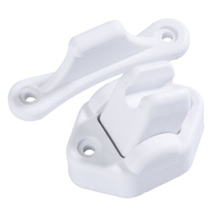 Tato aretace, dveřní zarážka pro dveře karavanů se díky pohyblivému spodnímu dílu přizpůsobí každému typu dveří. Rozestup mezi otvory pro uchycení do zdi je 30 mm a mezi otvory pro uchycení na dveře je 45 mm. Dveřní aretace s kloubem, bílá barva, rozměr 5 x 4 x 3 cm.