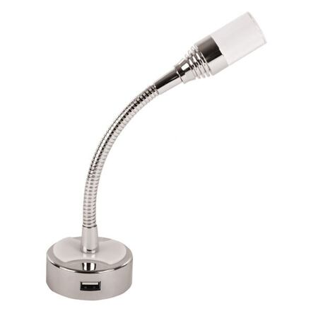Všestranná ohebná lampa s USB portemKvalitní LED lampička Dimatec vyrobená z chromované oceli s flexibilním ramenem a USB nabíjecím portem je ideální pro obývací prostor nebo ložnici ve Vašem obytném voze nebo karavanu. Svítidlo je vybaveno integrovaným spínačem praktického nočního režimu, který poskytuje modré tlumené světlo. Ohebné rameno je dlouhé cca 140 mm.Parametry:materiál: ocel (pochromovaná)barva světla: normální bílá / noční světle modránapětí: 10–14,4V DCtřída energetické účinnosti: Gnominální napětí: 12 Vjmenovitý výkon: 1 Wdélka ramene: 140 mmprůměr základny: 60 mmcelková délka: 230 mmUSB port: 5 V / 2,1A