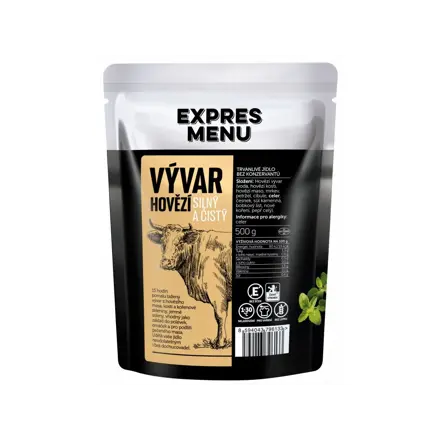 Silný a čistý hovězí vývar – základ pro perfektní polévku nebo omáčkuUžijte si kvalitní jídlo i během cestování nebo kempování. Poslouží Vám k tomu hovězí vývar od EXPRES MENU, který byl pomalu vařen po dobu 15 hodin. Toto jedinečné zpracování hovězího masa, kostí a kořenové zeleniny vytvoří základ, který bude sloužit pro Vaše polévky, omáčky nebo podlití pečeného masa. Jemně osolený a s čistou chutí je tento vývar ideální pro další využití a není potřeba ho dochucovat.Snadná příprava i v outdoorových kuchyních.Vlastnosti hovězího vývaru od EXPRES MENUbalení: 500 g (2 porce)složení bez lepku a bez éčekhotové sterilované jídlo od české rodinné firmy z Trutnovasnadná a rychlá přípravaideální pro přípravu na cestách nebo během kempování a stanováníSloženíhovězí vývar (voda, hovězí kosti, hovězí maso, mrkev, petržel, cibule, celer, česnek, sůl kamenná, bobkový list, nové koření, pepř celý)Příprava jídlaHovězí vývar EXPRES MENU můžete připravit třemi způsoby:Sáček s jídlem vložte do mikrovlnné trouby a ohřívejte zhruba 2 až 3 minuty při výkonu300 W nebo dokud nebude jídlo teplé. Při ohřevu buďte opatrní, delší doba ohřevu může vést k deformaci obalu.V další variantě stačí vyprázdnit obsah sáčku na talíř a ohřívejte v mikrovlnné troubě zhruba 2 minuty.Pokud nemáte k dispozici mikrovlnnou troubu, stačí sáčky vložit do hrnce s vařící vodou zhruba na 10 minut. Před podáváním jídla promačkejte.SkladováníVýrobek skladujte při teplotě od +1 °C do +30 °C. Po otevření skladujte v chladničce a spotřebujte do 48 hodin.Datum spotřebyMinimální trvanlivost je uvedena na obalu. Obvyklé datum spotřeby jsou 2 roky.Nutriční hodnoty na 100 gEnergetická hodnota:42 kJEnergetická hodnota:10 kcalTuky:0,1 gNasycené mastné kyseliny:0,1 gSacharidy:0,9 gz toho cukry:0,1 gBílkoviny:1,5 gVláknina:0,01 gSůl:0,5 g