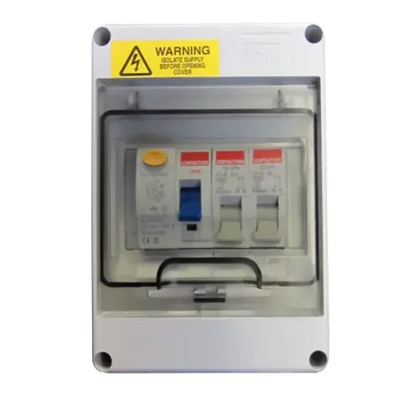 Jistící jednotkaJistící jednotka skládající se z plně izolované skříně obsahující proudový chránič a dva jističe.