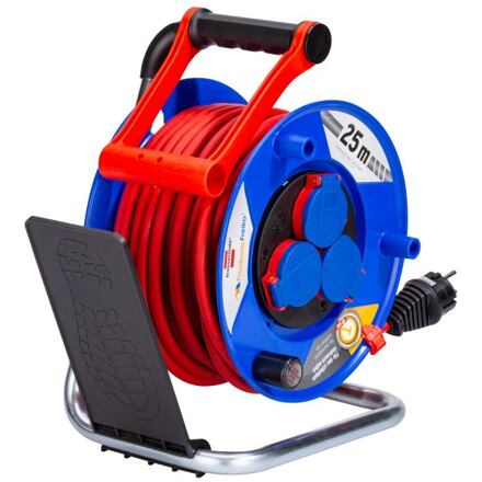 Bezpečnostní naviják s CEE zástrčkouBezpečnostní naviják se zástrčkou CEE pro venkovní použití. Snadná manipulace lehkým odvinutím. Dá se bezpečně přenést v ruce. 3 zásuvky jsou zabezpečeny vestavěnými ochrannými přepínači. Kabel 3 × 1,5 m². IP44 – chráněno proti prachu a stříkající vodě. Výstražná světla proti přepólování. Certifikace CE.Parametry:barva: červená, modrátřída ochrany IP: IP44délka kabelu: 25 mjmenovité napětí: 230 Vjmenovitý proud: 16 Arozměry (Š × V × H): 25 × 34 × 19 cmhmotnost: 4,9 kgrozměry balení (Š × V × H): 34 × 26 × 20 cm