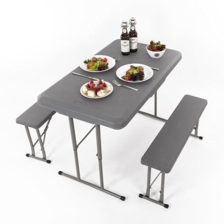 Skládací stůl se 2 lavicemi Camp4 Easy Kempingový stůl se 2 lavicemi Camp4 Easy je naprosto odolný vůči povětrnostním vlivům. Lavice je možné uložit do desky stolu a celou soupravu snadno přenášet nebo uložit. Pevný rám je vyroben z ocelových trubek a deska stolu z materiálu HDPE šedé barvy, takže se snadno udržuje v čistotě. Vlastnosti kempingového stolu se 2 lavicemi Camp4 Easy: Dokonale odolný vůči povětrnostním vlivům. Lavice je možné uložit do desky stolu. Soupravu lze snadno přenášet nebo uložit. Rám z ocelových trubek. Deska stolu z HDPE šedé barvy. Parametry: materiál konstrukce: ocelové trubky materiál desek: HDPE délka stolu: 105 cm šířka stolu: 65 cm výška stolu: 72 cm délka lavice: 85 cm šířka lavice: 20 cm výška lavice: 40 cm rozměry ve složeném stavu: 105 x 65 x 9 cm nosnost lavice: 200 kg hmotnost: 16,5 kg