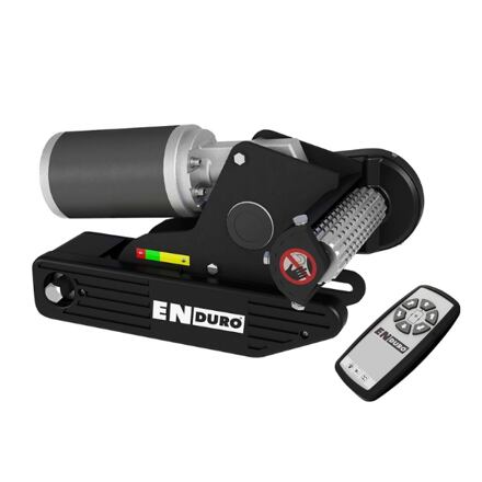 Poloautomatický pojezd pro karavan Enduro EM203 Mover Enduro EM203 pro manévrování s jednonápravovými karavany a přívěsy do celkové hmotnosti 1800 kg. Hnací válečky se přisouvají k pneumatikám karavanu pomocí ruční kliky. Robustní řetězový převod spolu s protiskluzovými hnacími válečky zajišťují bezpečný přenos síly na kola. S moverem je možno spolehlivě manévrovat na různých površích a bezpečně zastavit na svazích se sklonem 18 % při hmotnosti přívěsu 1450 kg. Součástí dodávky je řídící jednotka a dálkové ovládání. Díky technologii soft start a soft stop můžete svůj karavan ovládat s naprostou přesností a téměř bez trhavých pohybů. U jednonápravových přívěsů je bez problémů možné otočení kolem vlastní osy o 360°. S aplikací My Enduro můžete svůj karavan snadno ovládat telefonem nebo tabletem. Pro rozšíření systému je vhodné použít adaptér Bluetooth. Vlastnosti moveru Enduro EM203: Vhodný pro karavany do celkové hmotnosti 1800 kg. Protiskluzové hnací válečky se přisouvají a odsouvají pomocí ruční kliky. Bezpečný přenos síly na kola. Spolehlivě funguje na různých površích. Řídící jednotka a dálkové ovládání jsou součástí dodávky. LED indikace na dálkovém ovládání v případě přetížení nebo poruchy. Vybaven technologií soft start a soft stop. Lze ovládat s naprostou přesností a bez trhavých pohybů. U jednonápravových přívěsů je možné otáčení o 360°. Parametry: maximální celková hmotnost: 1800 kg maximální celková hmotnost na svahu 18 %: 1450 kg zdroj napájení: 12 V / 60-100 Ah průměrný / max. proud: 20 A / 100 A rychlost pojezdu: cca 10 cm/s šířka nápravy: 180 - 250 cm max. šířka pneumatiky: 205 mm hmotnost: cca 37 kg (bez baterie)