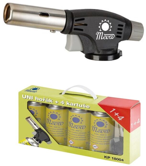 Sada hořáku a plynových kartuší Plynový hořák Meva Uni o výkonu 1,6 kW, který se dodává společně se 4 kartušemi, najde své využití v dílně, například při spojování měděných trubek, při kempování k zapalování grilu, ale i v domácnosti při vaření. Hořák používá jednorázové plynové kartuše s ventilem 227 g (typ KP02002). Piezo zapalování usnadňuje práci s hořákem. Klíčové vlastnosti plynového hořáku Meva Uni 1,6 kW: Hořák s teplotou plamene cca 1300 oC.Snadná manipulace, rychlý start díky piezo zapalování.Po předehřátí (cca 20 sekund) s ním můžete pracovat v libovolné poloze.Používá jednorázové kartuše s ventilem, které jsou součástí sady. Parametry plynového hořáku Meva Uni 1,6 kW: přibližná teplota plamene: 1300 oCpředpokládaná výdrž kartuše: 1 h a 40 mindélka: 330 mmšířka: 210 mmvýška: 72 mmhmotnost: 1,3 kgspotřeba plynu: 120 g/hvýkon: 1,6 kW