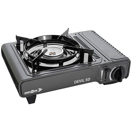 Patronový plynový vařič se zařízením pro poruchu plamene, integrované piezoelektrické zapalování a hliníkový hořák. Průtok plynu lze regulovat. Včetně přepravního kufříku.