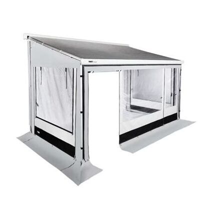 Přední díl stanu Thule Omnistor Residence G3 délka markýzy 5 m výška 185 cm Třetí generace osvědčeného stanu Safari Residence se skládá ze dvou dílů. Obou stěn a předního dílu v barvě RAL 9002. Každý díl se kupuje zvlášť a liší se zejména typem markýzy, ke které se stan staví a výškou markýzy v šesti možnostech, resp. její dolní hrany nad zemí. Oba boky jsou opatřeny okenní folií a moskytiérou s možností plného otevření.Boky i předek je opatřen kedrem, který zasunuje do rážky stavebního profilu. Se stavbou stanu G3 se můžete seznámit v odkazovaném videu. Druhé video je ukázkou modularity stanu Přední díl stanu má jeden vstup, od délky 3,5 metru dva vstupy a velké panoramatické okno a od délky 5 m dva vstupy a 2 okna. díky instalačnímu profilu lze přední díl kombinovat se slunečním blockerem.