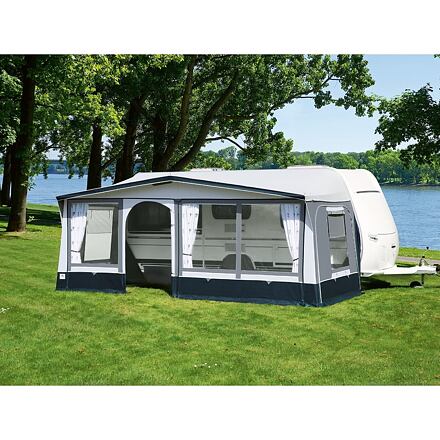 Přední stěna je zvenku potažena tak, aby bylo uvnitř stanu příjemné klima. Oba čelní díly je možné kombinovat a je tak jen na vás, zda chcete mít vchodové dveře umístěné uprostřed nebo napravo. Navíc lze obě stěny složit a vytvořit tak z předstanu otevřenou verandu.