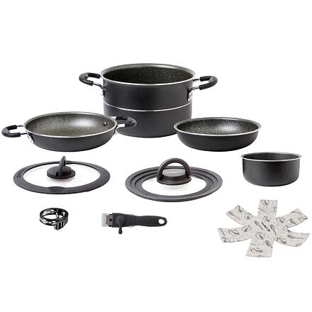 Nová praktická skládací sada hrnců Brunner. Sada je vybavena systémem "Vacublock", který zajistí, aby menší hrnce a pánvičky uvnitř sady během jízdy "necestovaly" a nedošlo tak k jejich poškození. Sada obsahuje: 1 hrnec s rukojeťmi ø 22 cm (5 l) 1 hrnec ø 18 cm (1,4 l) 1 pánev ø 22 cm s rukojeťmi (1,5 l) 1 pánev ø 20 cm (1,5 l) 1 skleněná poklička Corona ø 22 cm 1 skleněná poklička Corona Trio ø 22/20/18 cm (systém Vacublock) 1 velká odnímatelná rukojeť 1 popruh Parametry: barva: antracit počet ks nádobí v sadě: 8 materiál: hliník rozměry balení: 31 x 26 x 22 cm hmotnost: 2,9 kg