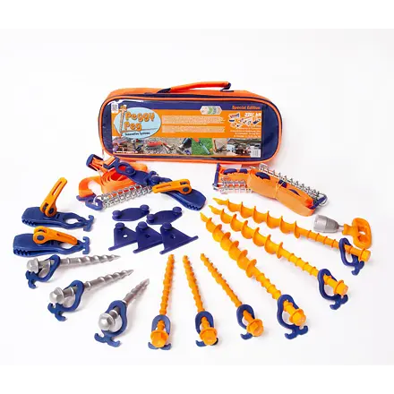 Sada k markýze Peggy Peg 270° se od předešlé sady liší rozmanitějším obsahem příslušenství a dílů. Neobsahuje však kotevní desku Peggy Peg Fix&Go 2.0. V sadě Peggy Peg najdete 3 různě dlouhé druhy šroubových kolíků s kontramaticemi, uchycovací Peggy Peg krokodýlky, 2 varianty háků a konektorů a dvoudílný šroubovák i s adaptérem. To vše je zabaleno v tašce, která Vám zpříjemní přepravu a skladování nářadí. Podívejte se na způsob použití jednotlivých součástí ve videu níže. Sada k markýze Peggy Peg 270° obsahuje: 3 x šroubový kolík Peggy Peg N 20 cm 3 x šroubový kolík Peggy Peg Schlag 15 cm 3 x šroubový kolík Peggy Peg L 32 cm 3 x Peggy Peg krokodýlek 6 x větší háky 3 x menší háky 3 x U-konektor 3 x T-konektor Dvoudílný šroubovák pro šroubové kolíky Peggy Peg s hliníkovým utahovacím adaptérem Transportní taška ze 100 % polyesteru (bez popruhu) Parametry: barva: oranžová, modrá rozměry (Š x V x H): 37 x 17 x 9 cm hmotnost: 1,4 kg Video