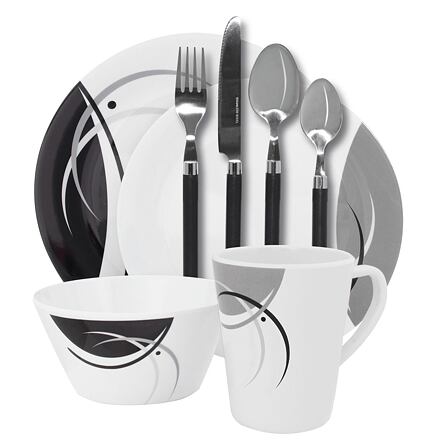 Osmidílná sada nádobí a příborů pro dvě osoby je ideální do karavanu i stanu. Není vhodné do mikrovlné trouby. Sada se skládá z: 2 talířů ø 25,8 cm 2 dezertních talířů ø 22,8 cm 2 cereálních misek ø 14,8 cm 2 hrnků ø 8,9 cm 2 sad příborů Parametry: počet kusů v balení: 16 materiál: melamin