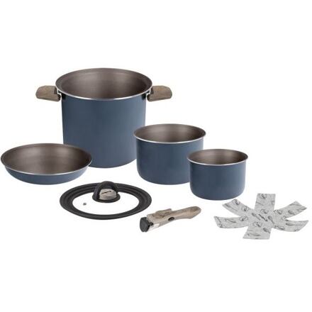 Set stohovatelných hrncůSada velkých hrnců Brunner Torralta je skvělou volbou pro cestovatele, kteří potřebují kvalitní, efektivní a prostorově úsporné nádobí. Tato inovativní sada byla speciálně navržena pro malé varné plochy a díky optimálnímu poměru povrchu k objemu umožňuje vařit i větší množství. Sofistikovaný design hran zajišťuje, že nádobí sedí bezpečně a neklouže, takže je ideální pro použití na nerovném terénu.Velké vnější hrnce a pánve jsou vyrobeny z recyklovaného hliníku, takže sada je nejen šetrná k životnímu prostředí, ale také mimořádně robustní a lehká. Skládací rukojeti zajišťují kompaktní a prostorově úsporné skladování, ideální pro omezené úložné prostory v obytných automobilech a karavanech nebo lodích. Sadu můžete používat na všech typech sporáků, včetně indukčních. Odnímatelné madlo pro menší vnitřní hrnce funkčně doplňuje sestavu a umožňuje ještě všestrannější použití.Klíčové vlastnosti sady velkých hrnců Brunner Torralta:Optimalizovaný poměr povrchu a objemu pro vaření většího množství.Nádobí bezpečně drží na vařiči díky speciálnímu designu hran.Kompatibilní se všemi typy sporáků včetně indukčních varných desek.Šetří místo při skladování díky sklopným rukojetím.Sada velkých hrnců Brunner Torralta obsahuje:1 hrnec s uchy ø 22 cm, výška 20 cm, objem 7,6 l1 pánev ø 22 cm, výška 5 cm, objem 1,9 l1 hrnec ø 20 cm, výška 15 cm, objem 4,7 l1 hrnec ø 18 cm, výška 13 cm, objem 3,3 l1 odměrka ø 11 cm, výška 11,5 cm, objem 1 l1 poklice ø 22/20/18 cm1 poklice ø 22 cm2 držáky na hrnceParametry sady velkých hrnců Brunner Torralta:barva: modrámateriál: hliníkprůměr: 22 cmhmotnost: 4,1 kgvelikost balení: 25 x 25 x 25 cm