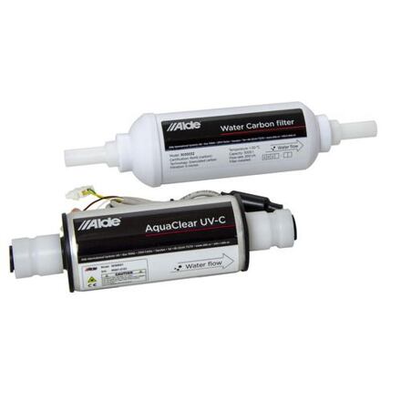 Filtry pro kvalitní vodu v karavanuSada filtrů Alde AquaClear UV-C LED/Carbon zajistí dezinfekci a vyšší kvalitu vody v nízkotlakých systémech, kde je voda plněna externě a skladována v nádrži, kde hrozí vyšší riziko mikrobiologického růstu.Dezinfekce je založena na UV-C světle prostřednictvím nejnovější UV-C LED technologie a vodního uhlíkového filtru Alde. AquaClear neutralizuje přibližně 99 % mikroorganismů během průtoku vody (až 4 litry za minutu).Protože pokles tlaku na Alde AquaClear je až 0,9 baru, doporučujeme čerpadlo na sladkou vodu s tlakem alespoň 2 bary.Klíčové vlastnosti filtrů pro úpravu vody Alde AquaClear:Účinně dezinfikuje a čistí vodu v karavanu a obytném voze.Odstraňuje chlór a zápach, likviduje bakterie E-coli, bakterie Legionella (99,9 % při průtoku vody až 4 l/min.). Bioanalýza ověřená akreditovanou laboratoří třetí strany.Snižuje obsah pesticidů a těžkých kovů ve vodě.Zlepšuje chuť pitné vody.Alde AquaClear vyhovuje požadavkům EU na pitnou vodu.Po připojení systému k Alde Compact 3030/3030 Plus se na ovládacím panelu topení zobrazí počet provozních hodin.Alde AquaClear má životnost přibližně 70 m3 vody nebo přibližně 300 hodin aktivního provozu. Při používání cca 20 minut denně je životnost přibližně 900 dní.Alde Carbon filtr by se měl měnit jednou ročně.Balení obsahuje:1 x Alde AquaClear UV-C1 x uhlíkový filtr Alde2 x svorky1 x adaptér pro 12 mm vodní hadici PEX2 x John Guest adaptér (přechod z tvrdé na měkkou hadici)1 x prodlužovací kabelParametry:hmotnost: 800 g