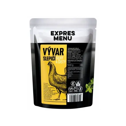 Silný a čistý slepičí vývar – ideální na dlouhé cesty nebo kempování v příroděSlepičí vývar EXPRES MENU je výsledkem 15 hodin dlouhého vaření, které umožňuje extrahovat všechny aromatické a nutriční látky ze slepičího masa a kořenové zeleniny. Tento jemně solený vývar je ideální jako základ pro polévky a omáčky, ale lze použít také samostatně pro zahřátí při sychravých dnech. Je to skvělá surovina pro Vaši outdoorovou kuchyni, která Vám umožní vytvářet chutná a zdravá jídla i během Vašeho dobrodružství mimo kuchyni.Vlastnosti slepičího vývaru od EXPRES MENUbalení: 500 g (2 porce)složení bez lepku a bez éčekhotové sterilované jídlo od české rodinné firmy z Trutnovasnadná přípravaideální pro přípravu na cestáchSloženíslepičí vývar (voda, slepice bez drobů, mrkev, petržel, cibule, celer, česnek, sůl kamenná, bobkový list, nové koření, pepř celý)Příprava jídlaSlepičí vývar od EXPRES MENU můžete připravit třemi způsoby:Sáček s jídlem vložte do mikrovlnné trouby a ohřívejte zhruba 2 až 3 minuty při výkonu300 W nebo dokud nebude jídlo teplé. Při ohřevu buďte opatrní, delší doba ohřevu může vést k deformaci obalu.V další variantě stačí vyprázdnit obsah sáčku na talíř a ohřívejte v mikrovlnné troubě zhruba 2 minuty.Pokud nemáte k dispozici mikrovlnnou troubu, stačí sáčky vložit do hrnce s vařící vodou zhruba na 10 minut. Před podáváním jídla promačkejte.SkladováníVýrobek skladujte při teplotě od +1 °C do +30 °C. Po otevření skladujte v chladničce a spotřebujte do 48 hodin.Datum spotřebyMinimální trvanlivost je uvedena na obalu. Obvyklé datum spotřeby jsou 2 roky.Nutriční hodnoty na 100 gEnergetická hodnota:35,1 kJ / 8 kcalTuky:0,08 gNasycené mastné kyseliny:0,03 gSacharidy:0,7 gz toho cukry:0,52 gBílkoviny:1,2 gVláknina:0,1 gSůl:0,34 g
