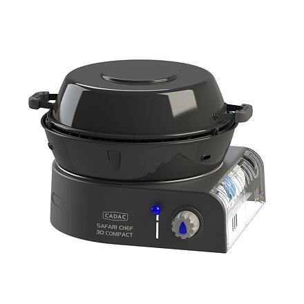 Nový Safari Chef Compact 30 je ultrakompaktní, lehký plynový gril. Funguje přímo s 220g bajonetovou kartuší. Plynovou kartuš stačí vložit do přístroje, zacvaknout a můžete začít vařit nebo grilovat. Ideální zařízení pro outdoorové aktivity a dovolenou v kempu. Navzdory své malé velikosti je Safari Chef Compact 30 extrémně všestranný, protože má různé povrchy pro vaření: stojan na hrnce, grilovací rošt (ne u verze LITE), gril a poklici, kterou lze použít také jako hrnec. Hrnec s polévkou nebo těstovinami lze snadno uvařit na podstavci. Grilovací rošt a grilovací rošt jsou pokryty povrchovou úpravou GreenGrill Cadac a jsou ideální pro pečení a grilování masa, ryb a zeleniny. Pokličku lze použít i jako (polévkový) hrnec a je tedy multifunkční. Odkapávač zachycuje zbytky vaření, ale zároveň slouží jako zábrana proti větru, aby hořák nezhasl. Součástí je odolná taška na přenášení/skladování, takže si Safari Chef Compact 30 snadno vezmete s sebou, ať jste kdekoli.