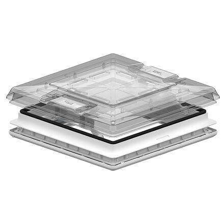 Odklápěcí střešní kapota s posuvným otevíráním, kterou lze otevřít ze všech stran. Standardně se zatemňovací roletou a moskytiérou . Vnější vrstva blackoutu je potažena žáruvzdorným hliníkem. Nucené větrání je vždy zaručeno. Odolné proti větru a dešti. Vhodné pro Turbo Kit. Rám : Vnější: bílý; Uvnitř: slonovina; Kapota : bílá nebo krystal. Maximální větrání: 150 cm2.