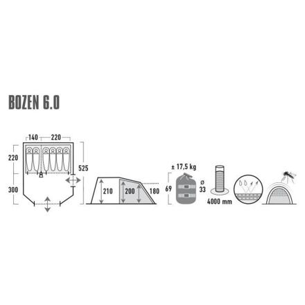 Rodinný tunelový stan High Peak BozenHigh Peak Bozen je rodinný tunelový stan navržený pro kempování pěti nebo šesti osob. Tento stan je vybaven několika praktickými funkcemi, které zajišťují pohodlný a bezpečný pobyt na vašich cestách.Vlastnosti tunelového stanu High Peak Bozen:Prostorný interiér. Stan má velkou obytnou část s výškou 2 metry, poskytující dostatek místa pro kempingové vybavení a pohodlný pohyb uvnitř stanu.Všitá podlážka zajišťuje ochranu před vlhkostí, špínou a lezoucími zvířaty.Ventilace a ochrana proti hmyzu. Dva gázové vstupy a dva stálé větrací otvory poskytují efektivní odvětrávání obytné části, zároveň zabraňují vstupu nepříjemného hmyzu.Dual Flow ventilace. Třístupňový systém ventilace v prostoru na spaní umožňuje přizpůsobení podle aktuálních podmínek (tropické noci, suché počasí, špatné počasí).Čtyři průhledná fóliová okna s možností zatažení záclon zajišťují dostatek světla a ochranu před zvědavými pohledy.Tepelná izolace. Střecha s hliníkovým povlakem odráží teplo, což přispívá k udržení příjemné teploty uvnitř stanu.Zatemněný vnitřní stan s Vario Vent Control System pro variabilní řízení ventilace zevnitř podle počasí.Praktické úložné prostory. Stan má pět organizérů a pět vnitřních kapes na náčiní.Dělicí stěna. Možnost rozdělení vnitřního stanu na velkou kajutu nebo dvě oddělená místa na spaní.Kabelový vstup se zipem pro vedení kabelů pro osvětlení.Parametry:počet osob: dvě varianty, 5 nebo 6materiál plátna: 100% polyester, podlepené švy, s PU zátěremmateriál podlážky: 100% polyethylenkonstrukce: ø 11 mm sklolaminát (GRP)vodní sloupec: 4000 mmrozměry (Š x V x H): 320 x 200 x 495 cm/380 x 210 x 525rozměry balení: 67,5 x 31 x 31 cm/76 x 32 x 30 cmhmotnost: 15,5 kg/17,5 kg