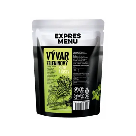 Jemně solený vývar - ideální surovina do outdoorových kuchyní, bez náročné přípravyŠest hodin šetrně tažený vývar z kořenové zeleniny je jemně solený a ideální jako základ pro polévky, omáčky nebo italské rizoto. Tento vývar dodá pokrmu výjimečnou chuť a vůni, aniž by bylo potřeba přidávat dochucovadla.Rychlé řešení pro přípravu jídel během pobytu v přírodě, při kempování nebo karavaningu.Klíčové vlastnosti zeleninového vývaru EXPRES MENU:balení: 500 g (2 porce)složení bez lepku a bez éčeksterilovaný výrobek od české rodinné firmy z Trutnovasnadná přípravaideální pro přípravu na cestáchSložení zeleninového vývaru EXPRES MENU:vývar ze zeleniny (voda, mrkev, petržel, cibule, celer, pórek, česnek, sůl kamenná, bobkový list, nové koření, pepř celýPříprava zeleninového vývaru EXPRES MENU:Zeleninový vývar od EXPRES MENU můžete připravit třemi způsoby:Sáček s jídlem vložte do mikrovlnné trouby a ohřívejte zhruba 2 až 3 minuty při výkonu300 W nebo dokud nebude jídlo teplé. Při ohřevu buďte opatrní, delší doba ohřevu může vést k deformaci obalu.V další variantě stačí vyprázdnit obsah sáčku na talíř a ohřívejte v mikrovlnné troubě zhruba 2 minuty.Pokud nemáte k dispozici mikrovlnnou troubu, stačí sáčky vložit do hrnce s vařící vodou zhruba na 10 minut. Před podáváním jídla promačkejte.SkladováníVýrobek skladujte při teplotě od +1 °C do +30 °C. Po otevření skladujte v chladničce a spotřebujte do 48 hodin.Datum spotřebyMinimální trvanlivost je uvedena na obalu. Obvyklé datum spotřeby jsou 2 roky.Nutriční hodnoty na 100 gEnergetická hodnota:47,6 kJ / 11,0 kcalTuky:0,05 gNasycené mastné kyseliny:0,01 gSacharidy:2,8 gz toho cukry:1,81 gBílkoviny:0,05 gVláknina:0,1 gSůl:0,37 g