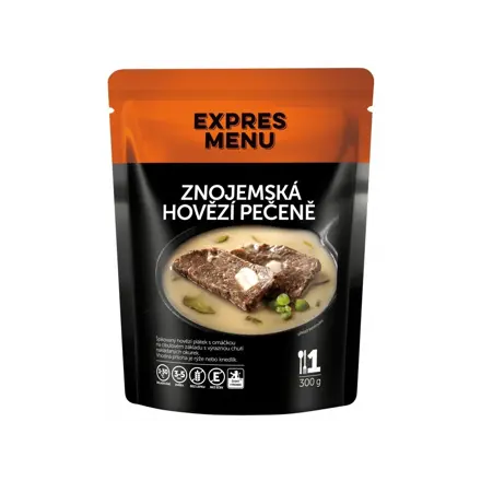 Znojemská hovězí pečeně – tradiční jídlo, které si vychutnáte bez složité přípravyHovězí plátek v omáčce dělané na cibulovém základu. Výrazná chuť nakládaných okurek je samozřejmostí.Doporučujeme přidat knedlík nebo rýži jako přílohu.Jídlo stačí pouze ohřát a můžete servírovat.Vlastnosti znojemské hovězí pečeně od EXPRES MENUbalení: 300 g (1 porce)složení bez lepku a bez éčekhotové sterilované jídlo od české rodinné firmy z Trutnovasnadná přípravaideální pro přípravu na cestáchSloženíhovězí maso zadní (33 %), hovězí vývar (voda, hovězí maso a kosti), cibule, okurky sterilované (okurky, voda, ocet kvasný, sůl, kořenící výtažek, hořčičné semínko), uzená slanina (vepřové sádlo), řepkový olej, rýžová mouka, kukuřičná mouka, sůl kamenná, pepřPříprava jídlaZnojemskou hovězí pečeni od EXPRES MENU můžete připravit třemi způsoby:Sáček s jídlem vložte do mikrovlnné trouby a ohřívejte zhruba 2 až 3 minuty při výkonu300 W nebo dokud nebude jídlo teplé. Při ohřevu buďte opatrní, delší doba ohřevu může vést k deformaci obalu.V další variantě stačí vyprázdnit obsah sáčku na talíř a ohřívejte v mikrovlnné troubě zhruba 2 minuty.Pokud nemáte k dispozici mikrovlnnou troubu, stačí sáčky vložit do hrnce s vařící vodou zhruba na 10 minut. Před podáváním jídla promačkejte.SkladováníVýrobek skladujte při teplotě od +1 °C do +30 °C. Po otevření skladujte v chladničce a spotřebujte do 48 hodin.Datum spotřebyMinimální trvanlivost je uvedena na obalu. Obvyklé datum spotřeby jsou 2 roky.Nutriční hodnoty na 100 gEnergetická hodnota:353 kJ / 84 kcalTuky:5,6 gNasycené mastné kyseliny:0,5 gSacharidy:3,8 gz toho cukry:0,4 gBílkoviny:5,5 gVláknina:0,1 gSůl:1 g